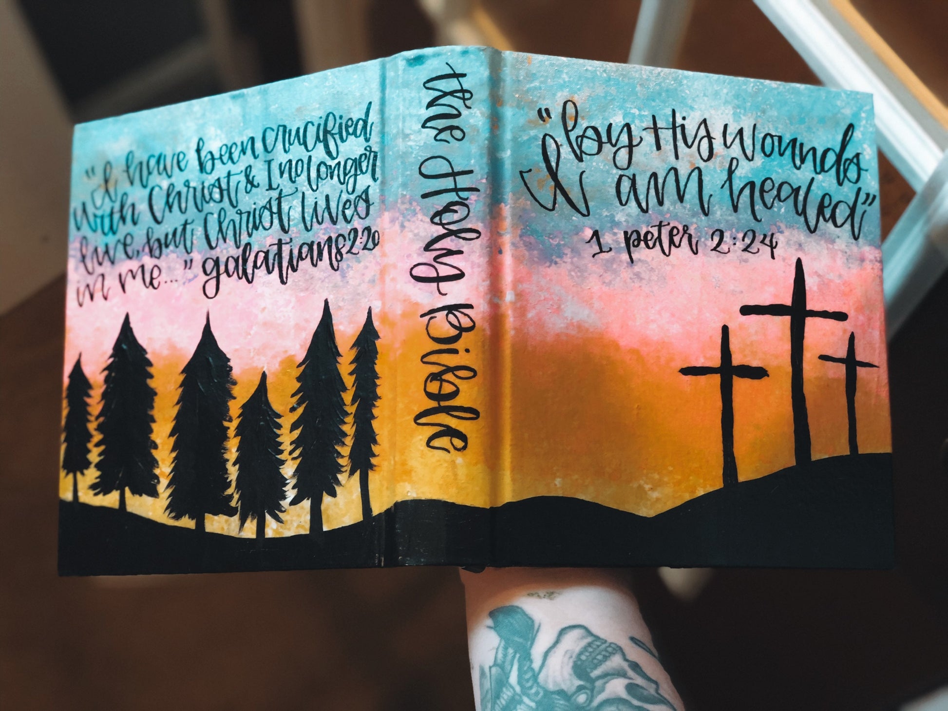 The Jaime Bible Custom Hand Painted Bible Sunset Cross Silhoue Sparrows Wildflowers