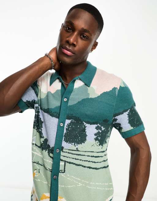 Abercrombie Fitch Getaway Scenic Print Button Through Knit Polo In Green Asos